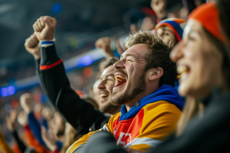 Amidst the electrifying atmosphere of the stadium, a sea of enthusiastic sports fans rises to their feet, their cheers echoing throughout the arena as they rally behind their beloved team, encouraging them towards victory with unwavering support.