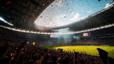 Packed stadium crowd celebrating with confetti and lights.