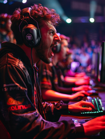 Excited gamer celebrating a victory at an esports event in a vibrant arena filled with cheering fans at night. Generative AI