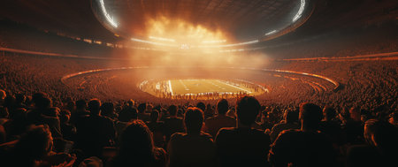 Stadium with football field at center, illuminated by orange lighting and smoke. Spectators watch from stands, creating energetic atmosphere under domed roof. Concept of sport events, victory.