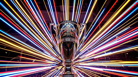 A close-up view presents a shiny golden trophy cup, prominently displayed against a backdrop of blurred stadium lights. The cup gleams with a polished texture, set in a dynamic composition. It suggests themes of competition and success within a large arena setting, suitable for various editorial and commercial applications.