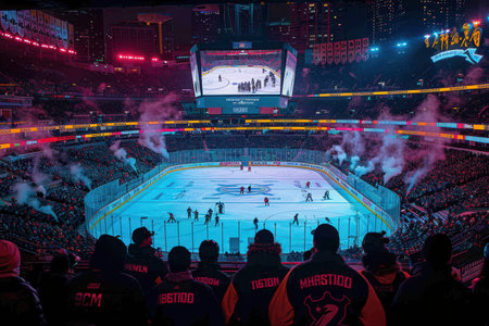 lively atmosphere hockey players embrace and cheer as they toss their gloves and sticks air celebrating their victory amid falling confetti evening match.