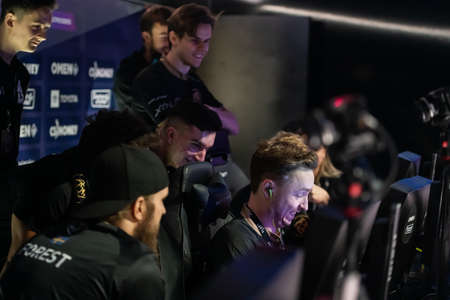 MOSCOW, RUSSIA - 14th SEPTEMBER 2019: esports Counter-Strike: Global Offensive event. Players booth with team Ninjas in Pyjamas legend Christopher GeT RiGhT Alesund inside on a stage.