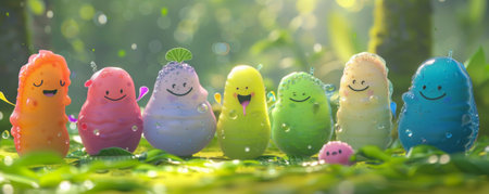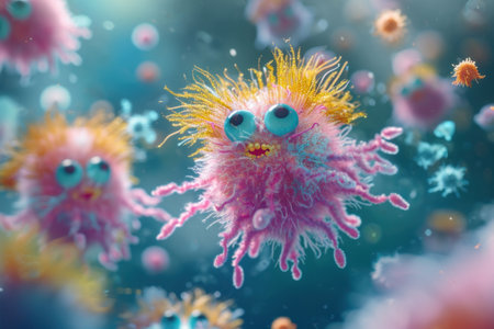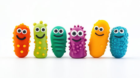 Bright and cheerful microbes with friendly expressions showcase vibrant colors against a simple background, creating a joyful atmosphere.