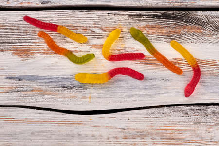 Colorful gummy worms on wooden background. Jelly worms on rustic wood with copy space. Holiday, party and junk food concept.
