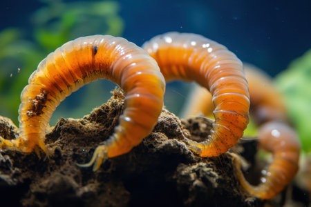Aquatic worms with vibrant orange tones curl gracefully as they navigate the sandy riverbed dotted with green aquatic plants