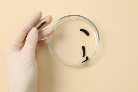 Woman doctor holds tweezers of medical leeches. Hirudotherapy, Hirudo medicinalis. Alternative medicine, bloodletting and rejuvenation of the body.