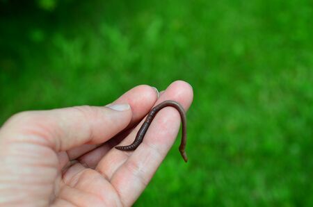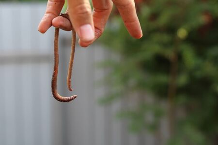 close-up, a worm in the hand of a man who wants to put it on the hook, against the background of the handle of the fishing rod