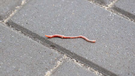 Closeup macro pink earthworm crawling through green moss on forest floor