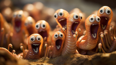 Amusing caricature of smiling cartoonish parasitic worms. A humorous take on helminths. Concept of fun educational material, playful science illustration, and engaging learning.