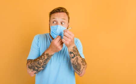 Afraid man with beard, tattoo and mask for wants to smoke a cigarette