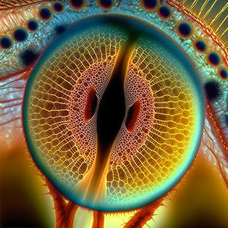 Detailed close-up of a human eye, featuring vibrant iris colors, a dark pupil, and delicate eyelashes, emphasizing the intricacies of human anatomy and vision