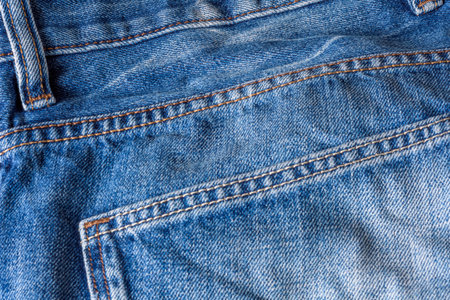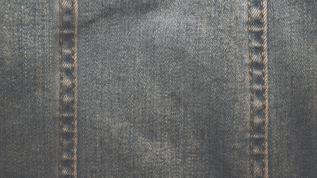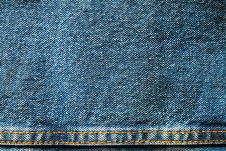 Selective focus blue jean denim top view close up shot to the detail of fabric. textile material and cotton patter tough and durable garment style. For background or wallpaper with copy space for text