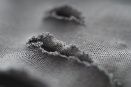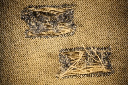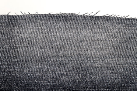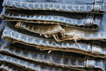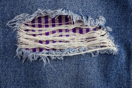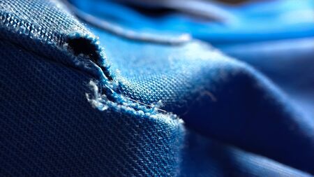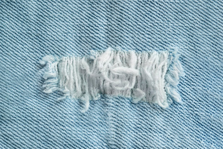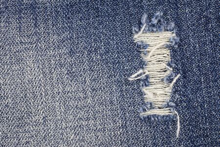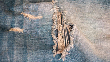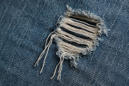 Detailed macro shot of ripped denim cloth with frayed edges, highlighting fabric texture and rugged imperfection for fashion and textile backgrounds