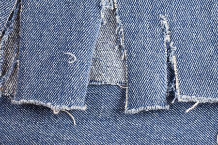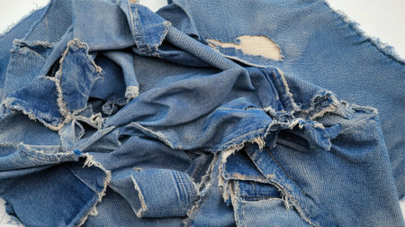 A collection of frayed and torn denim fabric showcasing various shades of blue, perfect for fashion design, textile art, or crafting projects.