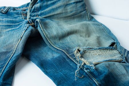 Denim background. Blue ripped jeans close-up. Denim is stylish.