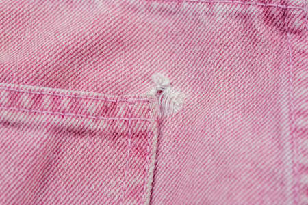 A close-up of a frayed pink jeans pocket, a torn off pocket.