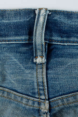 clothing items blue washed faded jeans cotton fabric texture with seams, clasps, buttons and rivets, macro