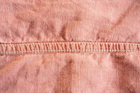 Fabric background in pink color with stitches. Copy space. Flatley.
