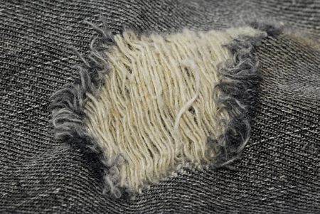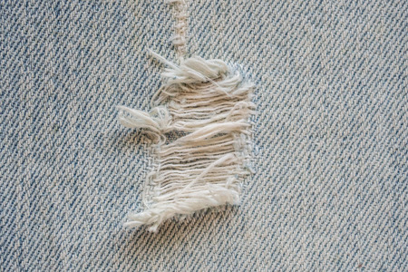 A close-up view of distressed denim featuring a prominent frayed tear and unique texture