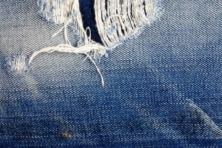 Denim background in blue fabric with distressed takani. Blue ripped jeans close-up. Denim stylish. Textile.