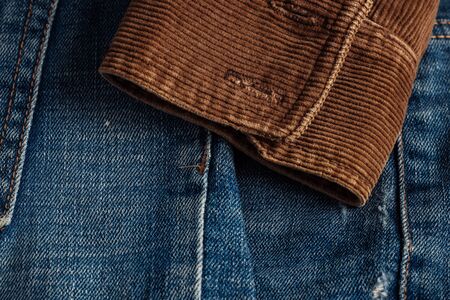 Corduroy skirt or trousers with a pocket, close-up. Copy space.