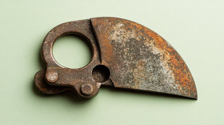 This image features a vintage cutting tool with a circular handle, showcasing rust and wear. Its unique design and texture reflect a rich history in craftsmanship.