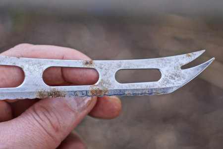 hand holding one old white iron blade of cheese knife in rust spots on gray background