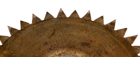 old rusty grunge circular electric saw disk part closeup isolated on white bakcgound.