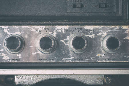 Close up of an old radio with dials and tuning knobs showing the wear and tear of time