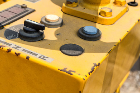 A close-up view of a weathered control panel featuring colorful buttons and levers, capturing the essence of vintage machinery in an industrial backdrop.