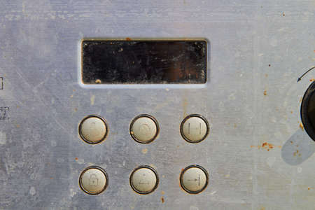 This image features a close-up view of a weathered control panel, showcasing illuminated buttons in red and orange. The panel exhibits signs of wear, providing a unique industrial aesthetic.