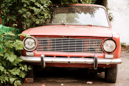 Old abandoned and forgotten rusty vintage retro car in bad condition.