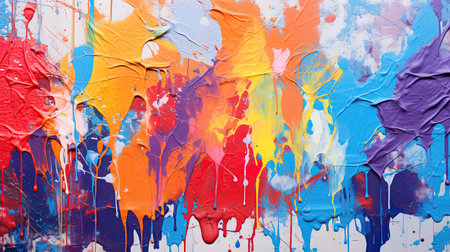 Colorful paint splashes and drips in red, blue, yellow, and white create a dynamic abstract composition on a black canvas. the texture adds depth and energy, making it ideal for use in contemporary art designs or creative backgrounds. Generative AI