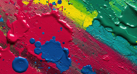 A vibrant, abstract close-up of colorful paint splashes on a canvas, creating a rough yet artistic texture that invites the viewer to explore every stroke.