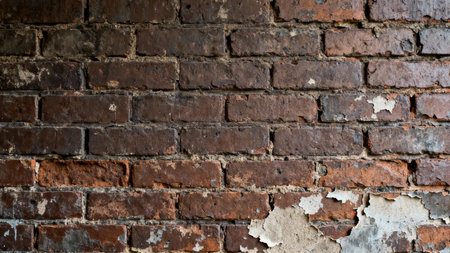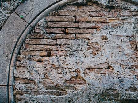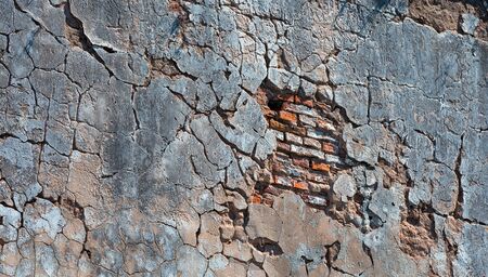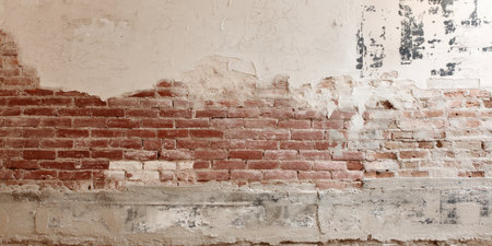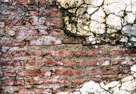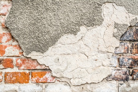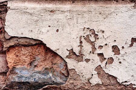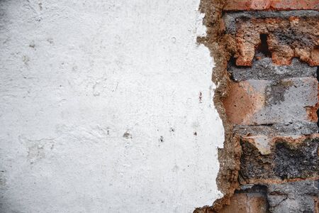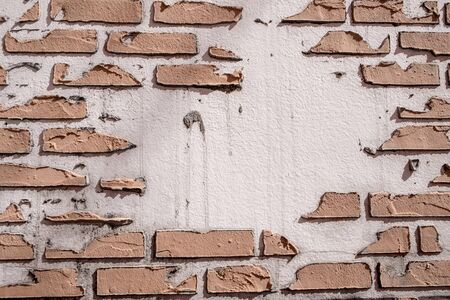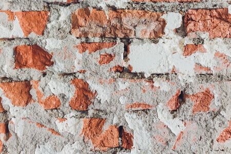 Old brick wall with peeling white plaster, rustic texture. Vintage architecture concept