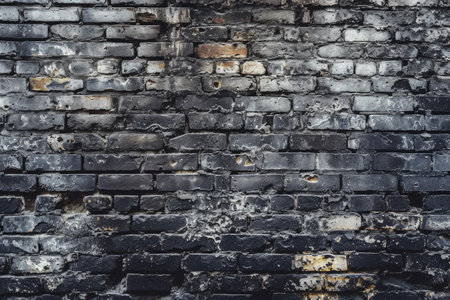 Close up view of an industrial styled aged brick wall composed of highly textured dark gray and sporadic reddish orange blocks with messy, thick mortar.