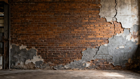 Weathered orange and brown brickwork contrasting with damaged gray concrete plaster, featuring extensive deterioration and peeling texture in a derelict warehouse environment.