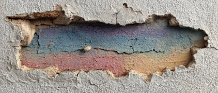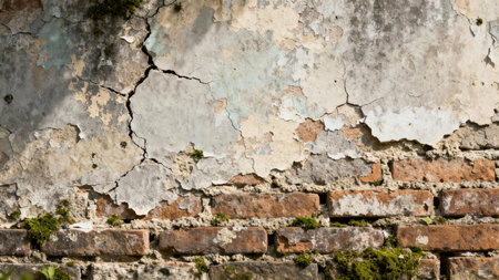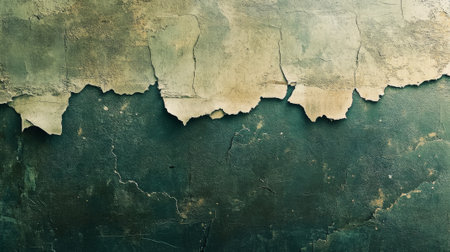 A close-up view of a distressed urban wall featuring peeling paint and cracked surfaces, ideal for backgrounds in design, marketing, or artistic projects.