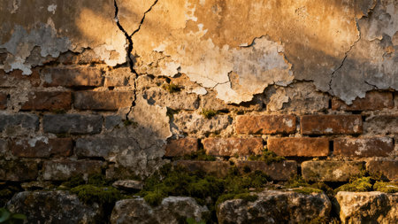 Texture of crumbling ochre plaster atop weathered red masonry bricks and rough stones covered with dark green moss, dramatically lit by intense golden hour light.
