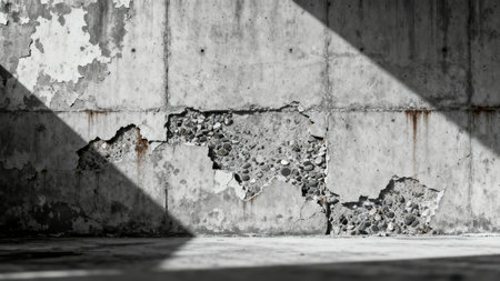 Exterior view of a deteriorating concrete barrier featuring deep fissures and two large spall holes revealing interior aggregate, highlighted by sharp diagonal sun shadows and contrasting spots of...