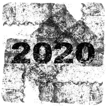 Year 2020 written with vintage letterpress printing blocks on silver colored textured background