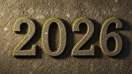 Textured stone numbers forming '2026' year with moss growing on a rough surface