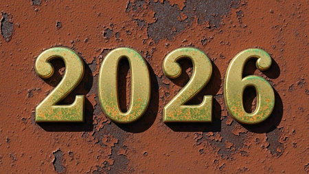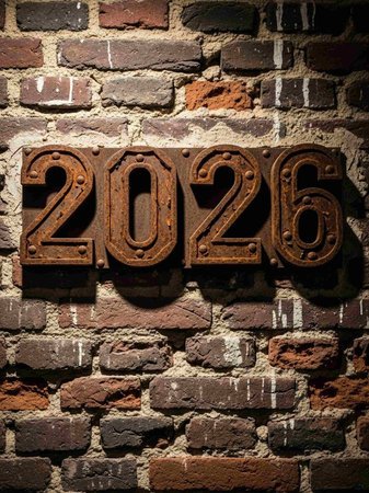 Massive 3d concrete numerals stand out against a gritty textured backdrop, their sharp shadows enhancing an industrial aesthetic that signifies the upcoming year.