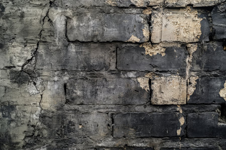 A close-up view reveals a textured wall with peeling paint, presenting an abstract pattern. The color palette primarily features dark tones with patches of lighter shades, creating contrast. The composition is likely within an interior space, with potential uses in design or as a background element. It could be suited for a variety of commercial applications.