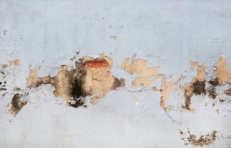Old Wall with Moldy Peeling White Painting from Humidity. Cracked White Wall as Rusty Concrete Weathered Wall Grunge Background or Abstract Backdrop Wallpaper Vintage Texture Design Copy Space Text