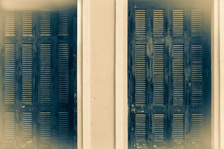 old wooden sun blind closeup at the closed windows in retro style