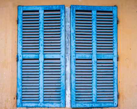 Mediterranean style window. Blue on yellow wall with closed shutters
