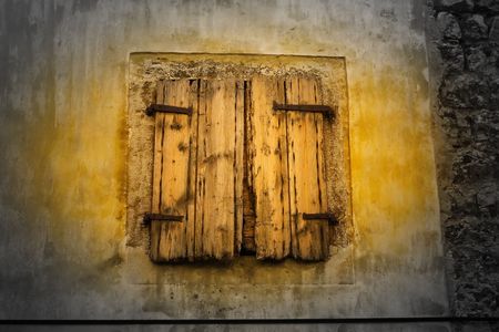 Old stone wall with closed weathered wooden shutters window.