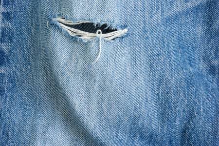 Close up of hole in an old pair of blue jeans showing the frayed threads.